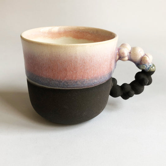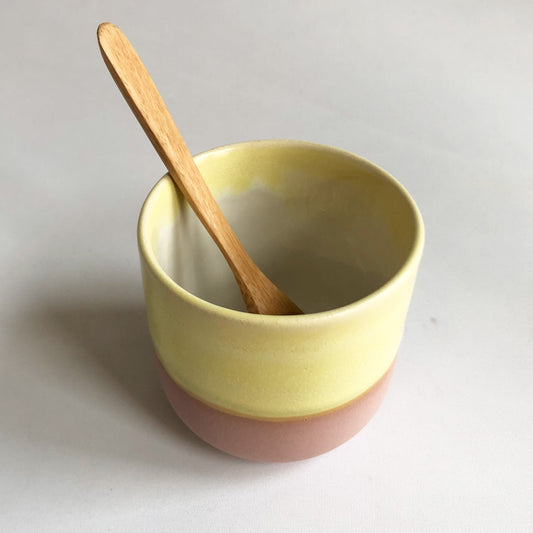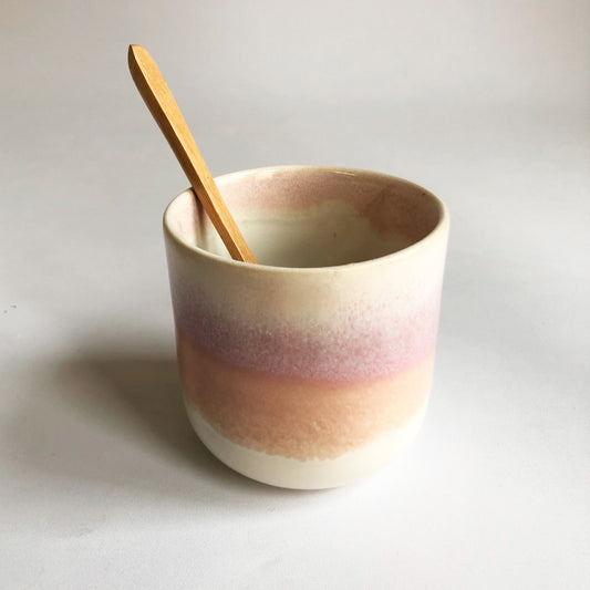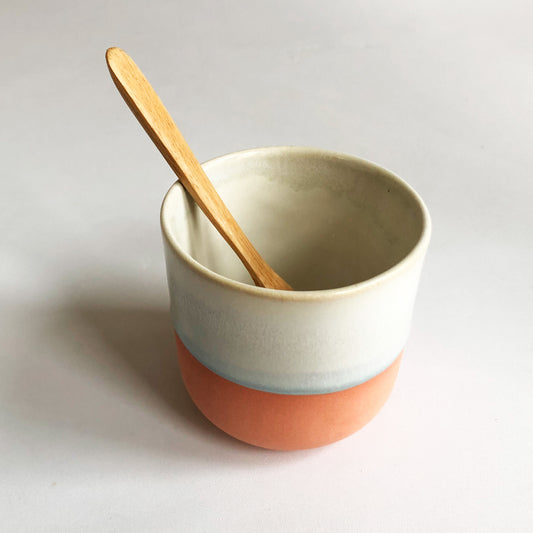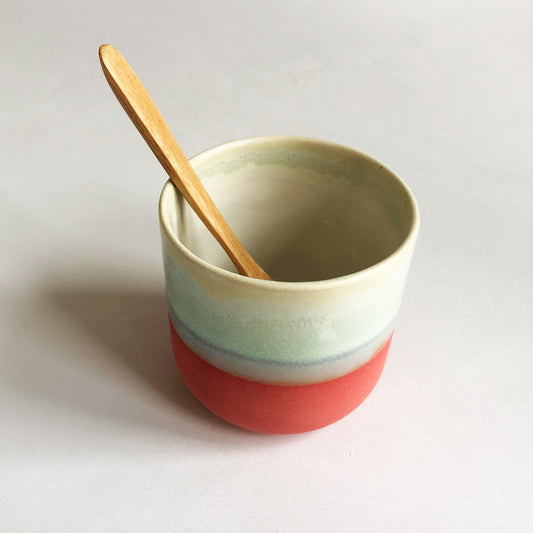 Lille kop uden hank med mat koralfarvet bund og isblå glasur