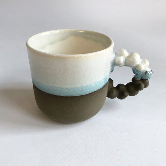 Lille kop med mat mørk olivenfarvet bund og isblå glasur
