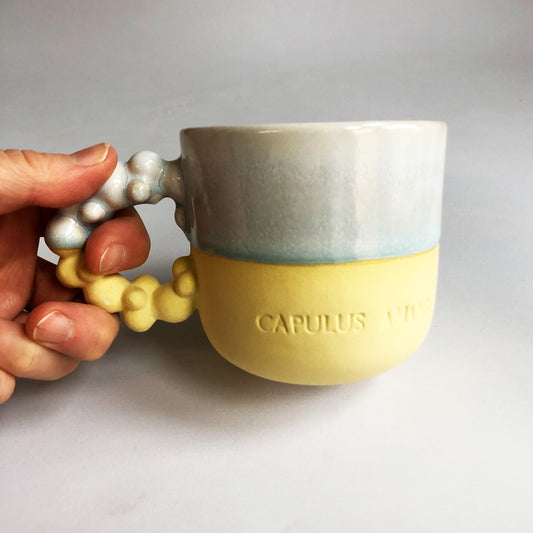 Stor kop med tekst. Koppen har gul mat bund og isblå glasur