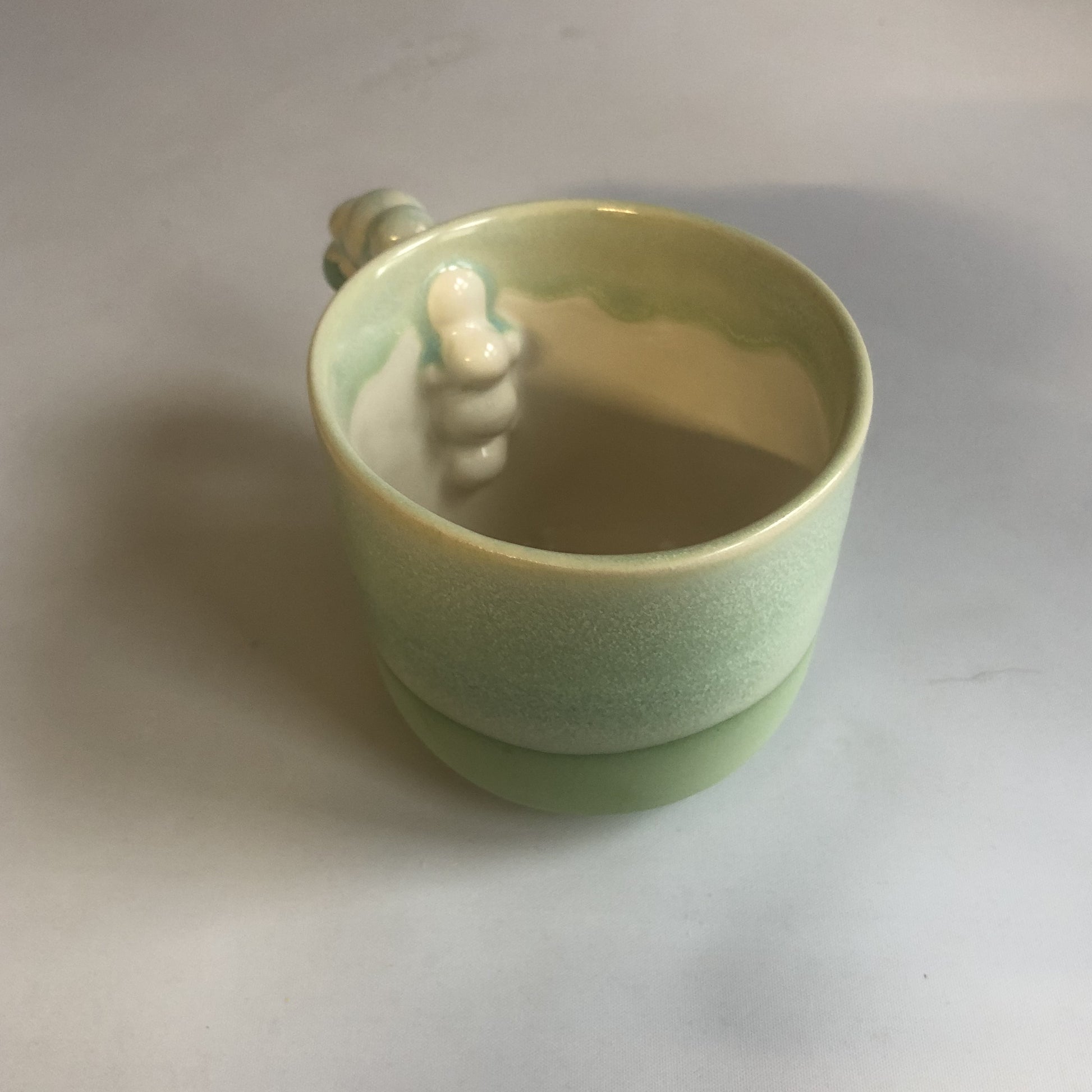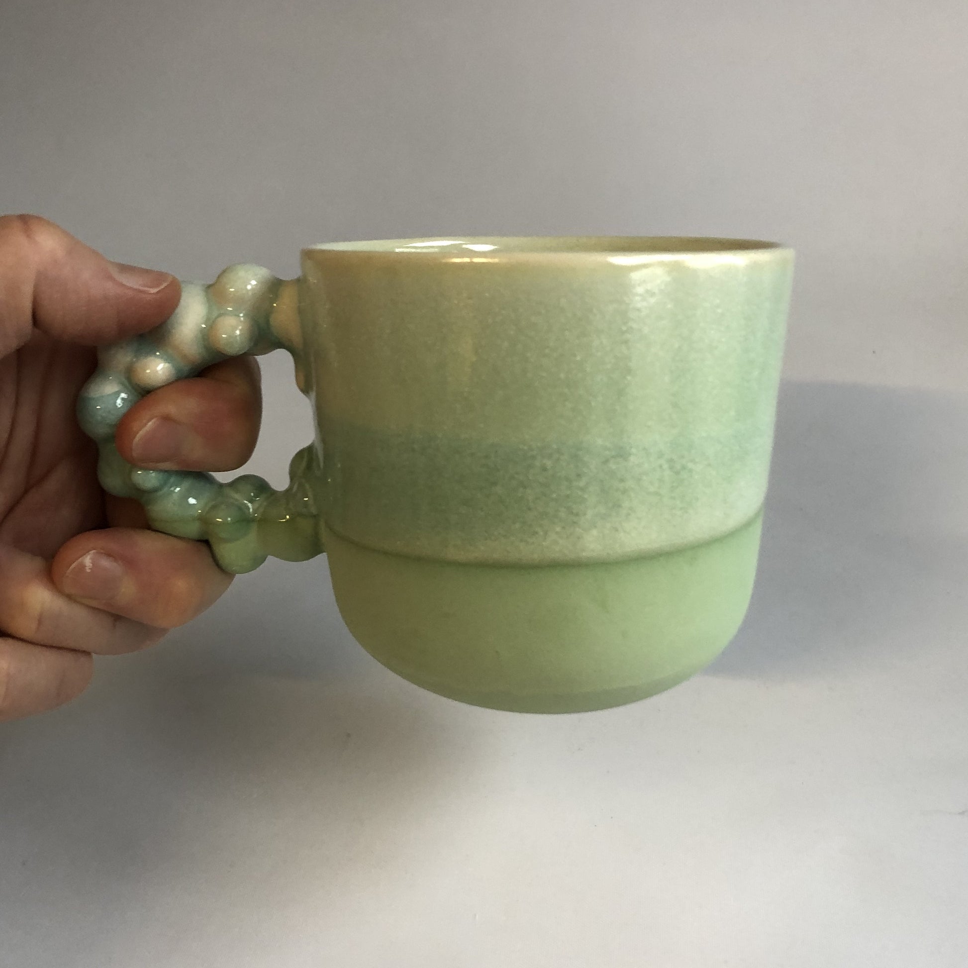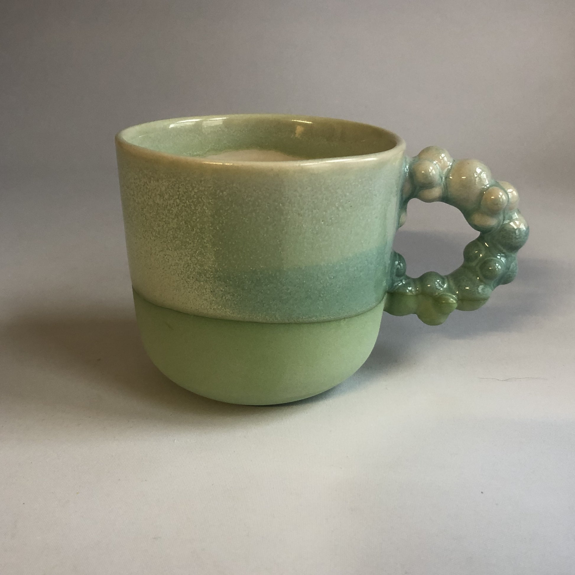 Håndlavet kop i stentøj. Alle kopperne er unikke, da hanken er sat på forskelligt. Denne kop har mat bund og blank glasur på den øverste del af koppen.
