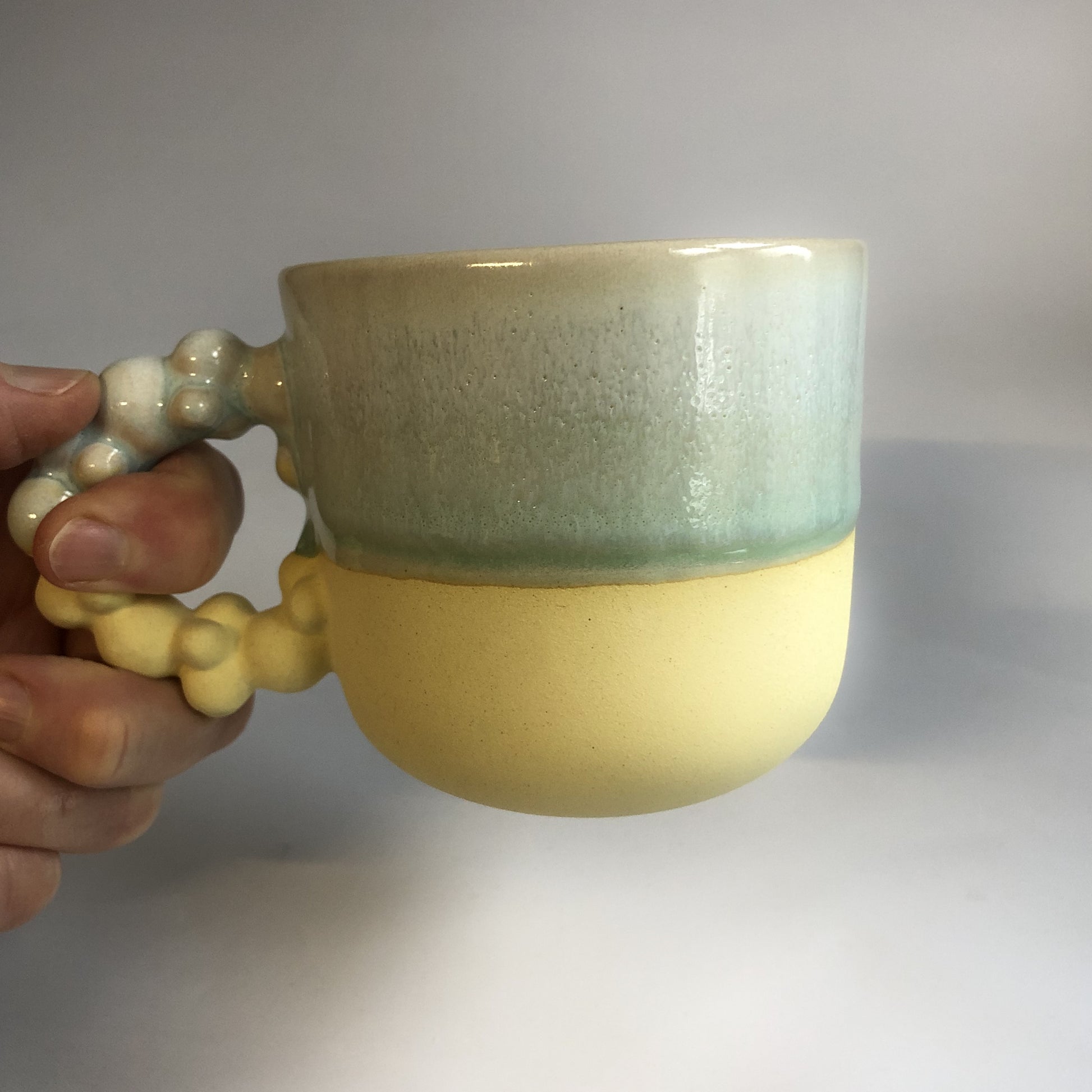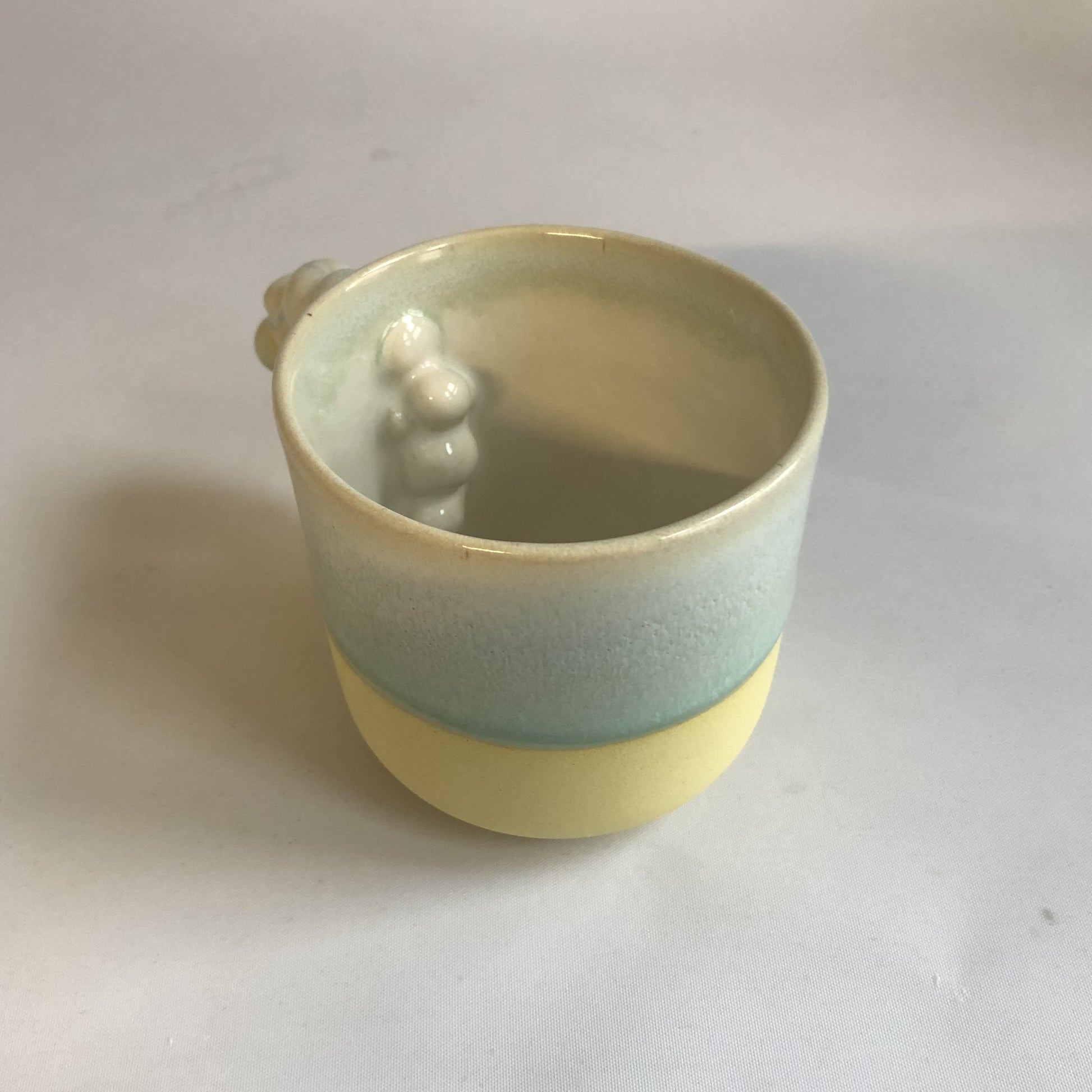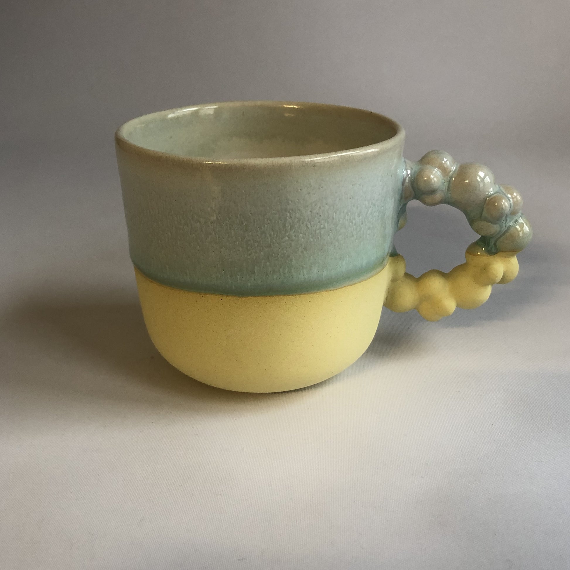Håndlavet kop i stentøj. Alle kopperne er unikke, da hanken er sat på forskelligt. Denne kop har mat bund og blank glasur på den øverste del af koppen.