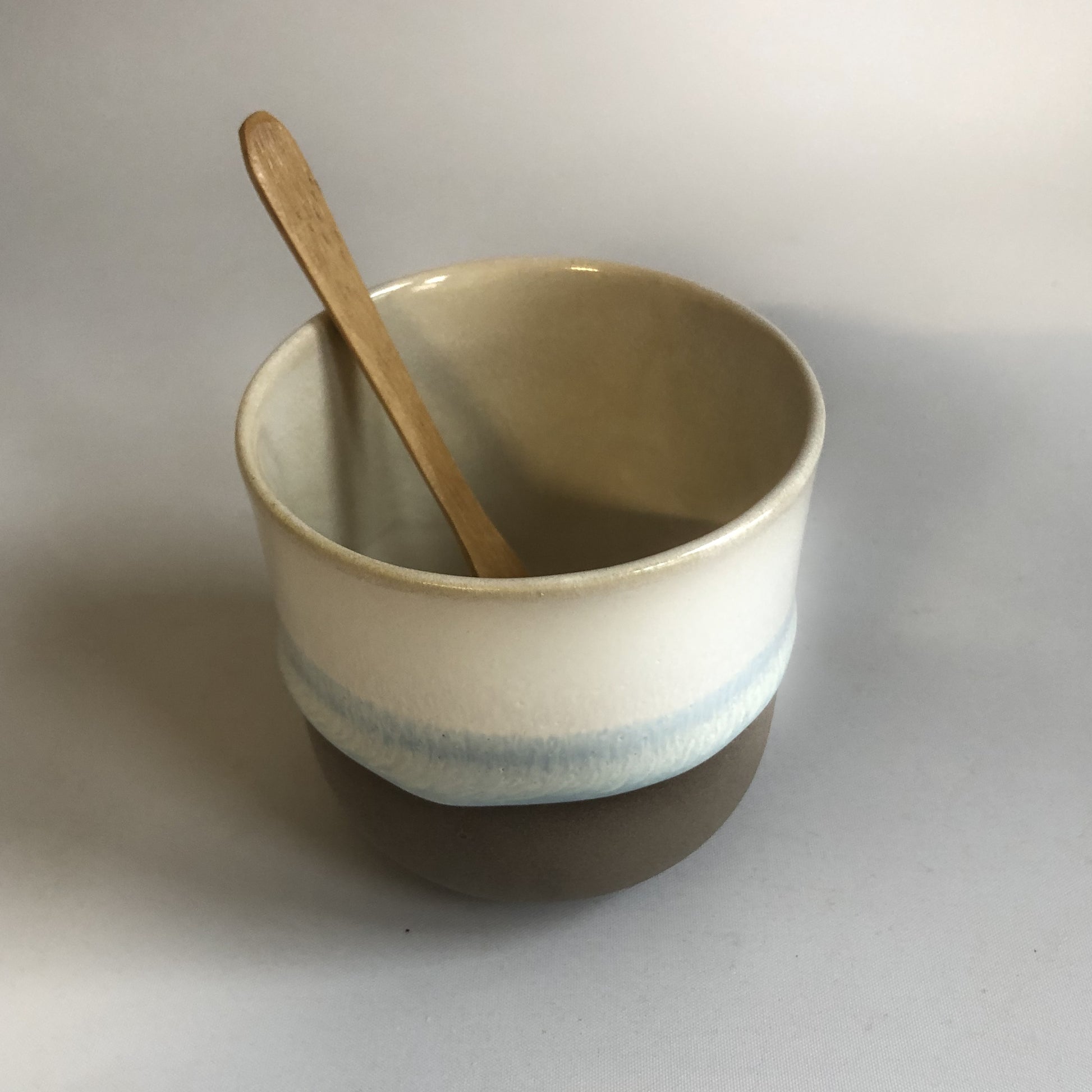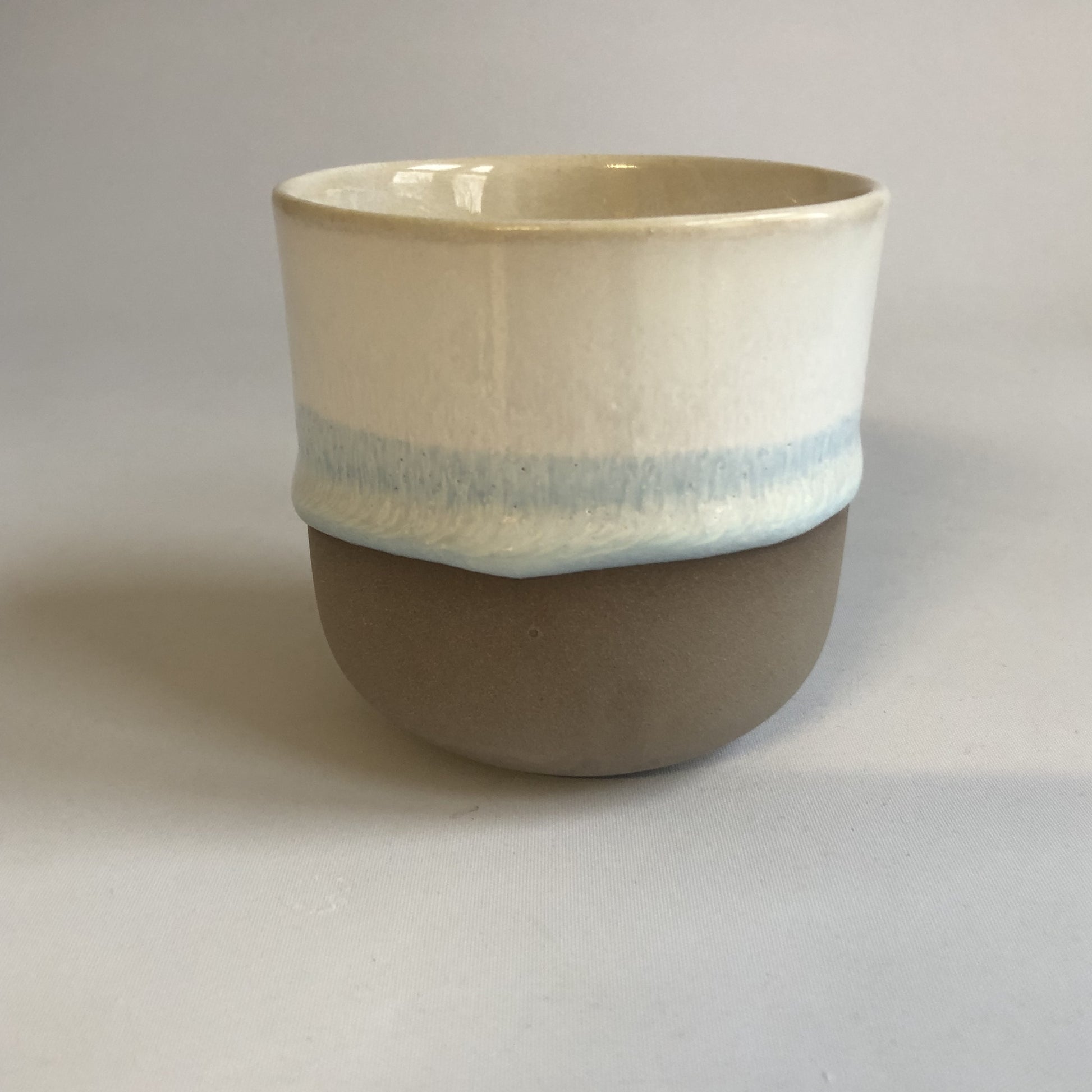 Håndlavet kop i stentøj. Denne kop har mat bund og blank glasur på den øverste del af koppen. Koppen kan b.la. bruges til kaffe, snacks, dip eller lign.